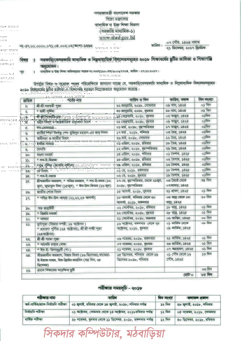 | 54 | ১৯-০৮-১৮ | মাধ্যমিক বিদ্যালয়ের বার্ষিক ছুটির তালিকা-২০১৮ খ্রিঃ |