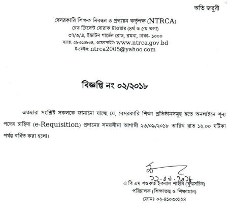| 46 | ১২-০৯-১৮ | শূন্য পদের চাহিদা (e-Requisition) প্রদানের সময়সীমা বৃদ্ধির নোটিশ |
