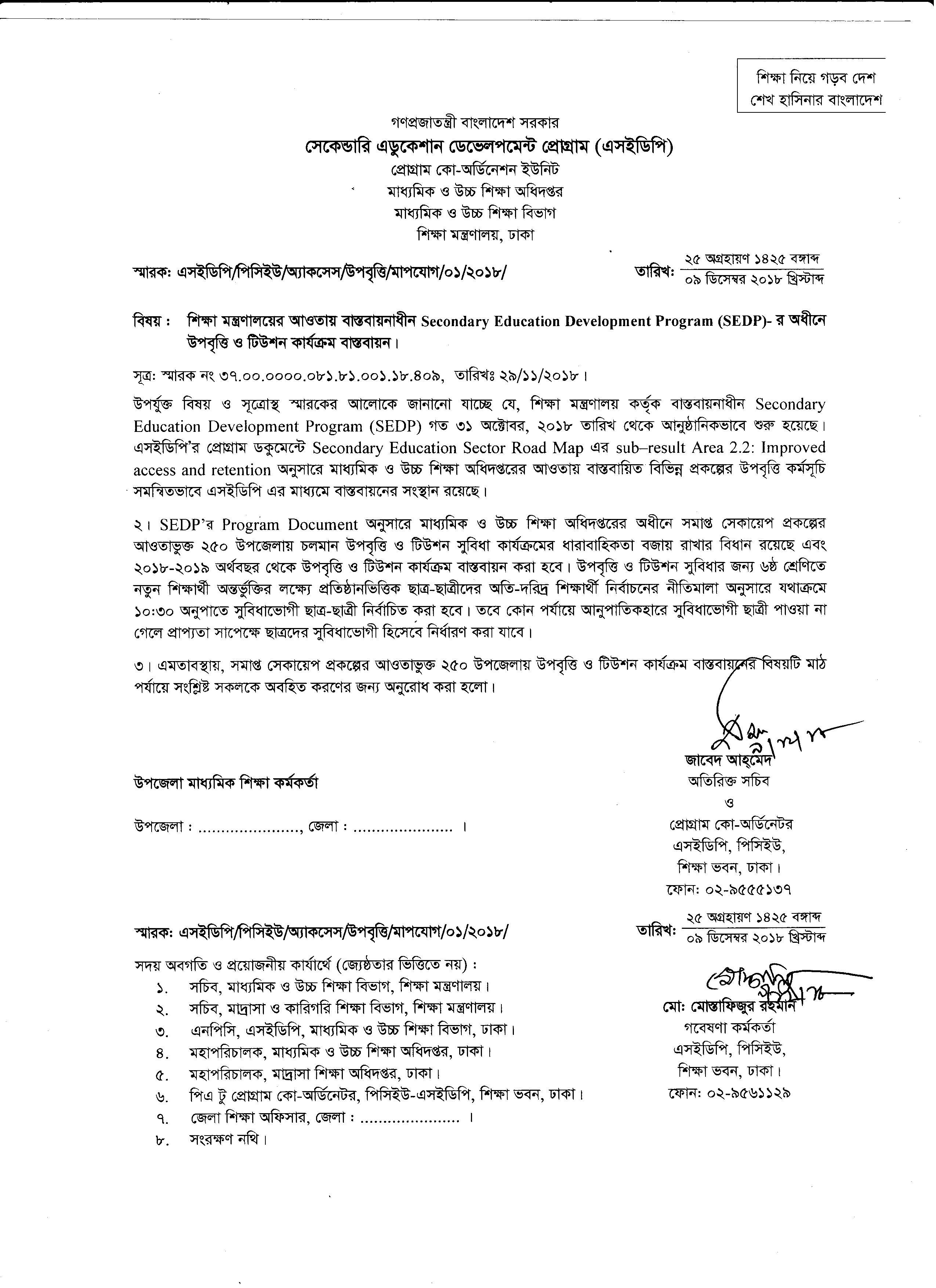 | 30 | ১৯-১২-১৮ | শিক্ষা মন্ত্রণালয়ের আওতায় বাস্তবায়নাধীন Secondary Education Development Program (SESDP) – র অধীনে উপবৃত্তি ও টিউশন কার্যক্রম বাস্তবায়ন। |