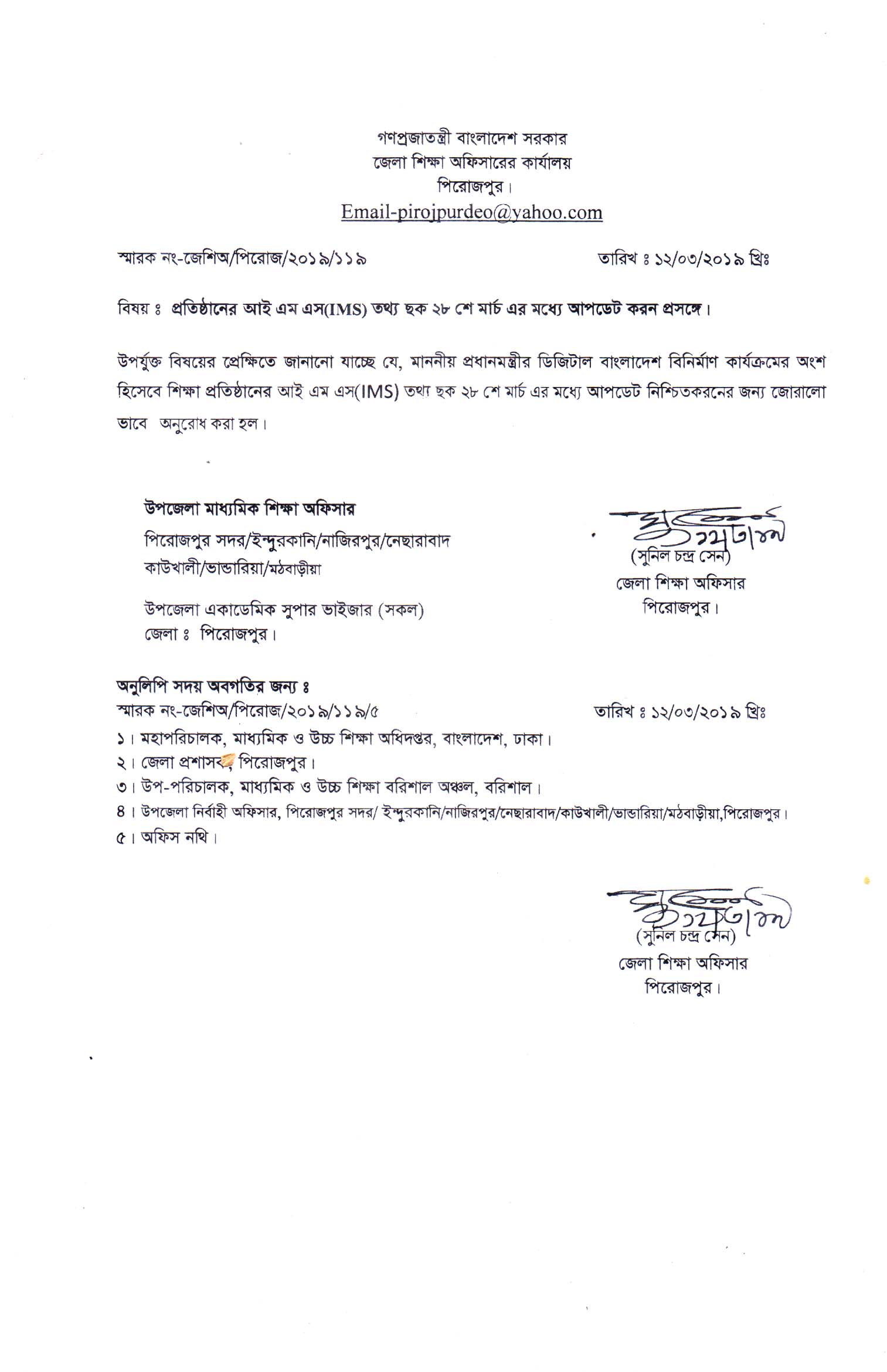 | 6 | ১৮-০৩-১৯ | প্রতিষ্ঠানের আইএম এস (IMS) তথ্য ছক ২৮ শে মার্চ এর মধ্যে আপডেট করন প্রসংগে। |