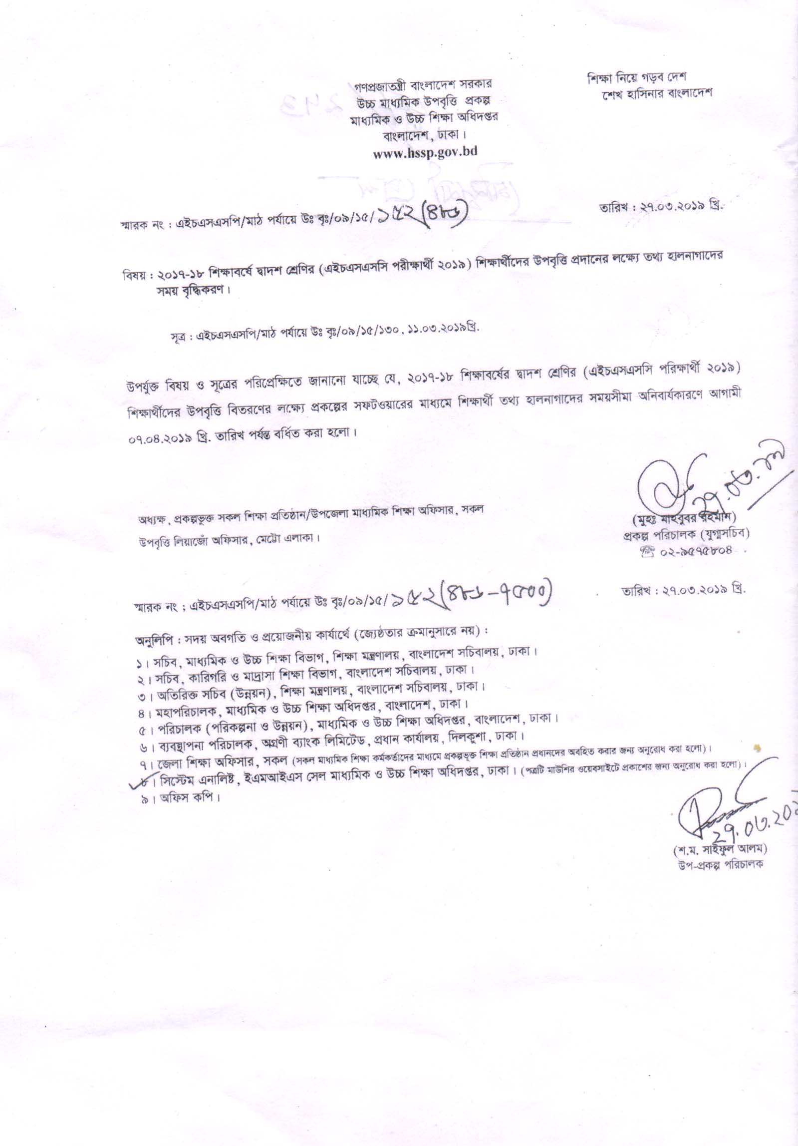 | 1 | ৩১-০৩-১৯ | 2017-2018 শিক্ষাবর্ষে দ্বাদশ শ্রেণির (HSC পরীক্ষার্থী ২০১৯) শিক্ষার্থীদের উপবৃত্তি প্রদানের লক্ষ্যে তথ্য হালনাগাদের সময় বৃদ্ধিকরণ প্রসংগে। |